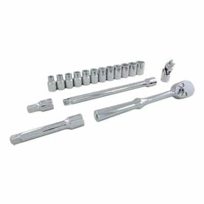 Set Includes: 10 , 11, 12, 13, 14, 115, 16, 17, 18, 19 , 20, 21MM Reversible Ratchet, Flex Handle, Universal Joint, 5 Inch Extension, 10 Inch Extension, Metal Box # 9101